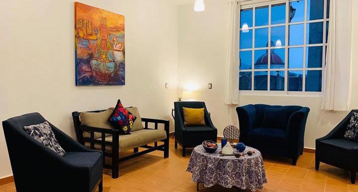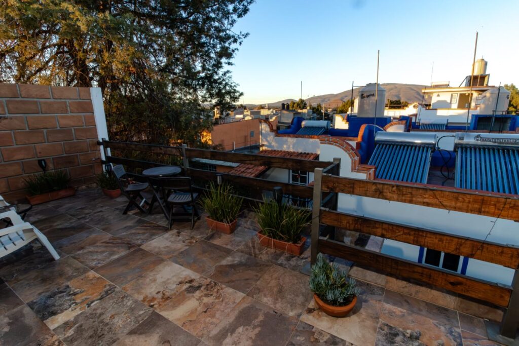 Nuestro comedor-cafetería se encuentra en una de las casas más antiguas del pueblo, donde podrás disfrutar de su encanto colonial mientras saboreas tu capuchino. Nuestra terraza en la azotea ofrece espectaculares vistas de la iglesia del siglo XVIII, justo al lado, y de la Pirámide del Sol. Pasea por nuestro serpenteante sendero central entre las casitas y los jardines de nuestra propiedad, perfumados con madreselva, lavanda y rosas, bajo nuestros románticos balcones de hierro forjado, y recuerda que la paz reside en tu corazón y que puedes cultivar la belleza en tu vida.